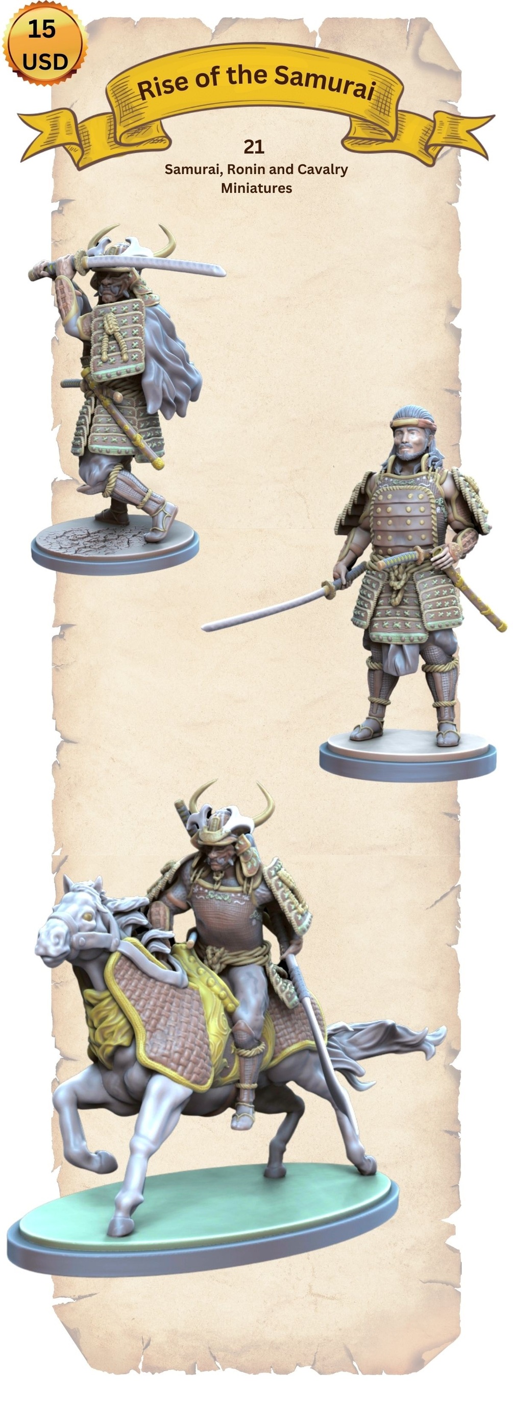 The campaign contains 150 printable miniatures for only 29 USD as well as a brand new special set of Samurai warriors and Ronin for only 15 USD, if you liked the mini, please follow the campaign page and pledge and support us create more amazing minis and deals like this one